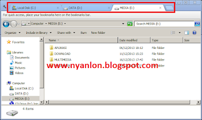 Kali ini saya akan berbagi software Membuka Banyak Tab di Windows Explorer, hah..emank bisa ?? tentu bisa, biasanya kita sering membuka banyak tab di browser Mozilla, Chrome, Opera dan lain lain. Saat ini kita masih kesulitan ketika sedang mengoperasikan Windows dengan membuka banyak Tab Windows, yang dimaksud Tab ini bukanlah sekelompok Bar yang dikumpulkan dalam satu jendela, Aplikasi ini cukup ringan yaitu CLOVER. untuk lebih jelasnya lihat gambar dibawah ini :